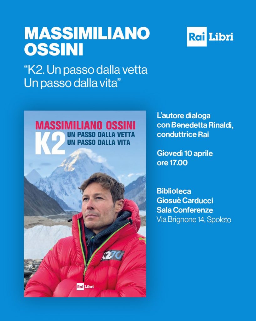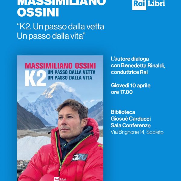 Doppio appuntamento a Spoleto con gli autori di Rai Libri. Giovedì 10 aprile alle ore 17.00 Massimiliano Ossini presenterà, con la conduttrice Benedetta Rinaldi, il volume “K2. Un passo dalla vetta un passo dalla vita” (Rai Libri), racconto appassionante del viaggio con il quale l’autore ha documentato in prima persona la spedizione di alpiniste italiane e pakistane che ha scelto di sfidare gli 8611 metri della seconda montagna della Terra. Venerdì 11 aprile alle ore 17.00 Beppe Convertini presenterà insieme all’attrice Simona Borioni “Il Paese azzurro. Un viaggio alla scoperta delle coste della nostra Italia e del suo mare”, che vede l’autore alla scoperta di storie e tradizioni, di antichi mestieri e di eccellenze enogastronomiche. Gli eventi si svolgeranno alla Sala Conferenze della Biblioteca Giosuè Carducci in via Brignone 14 a Spoleto.