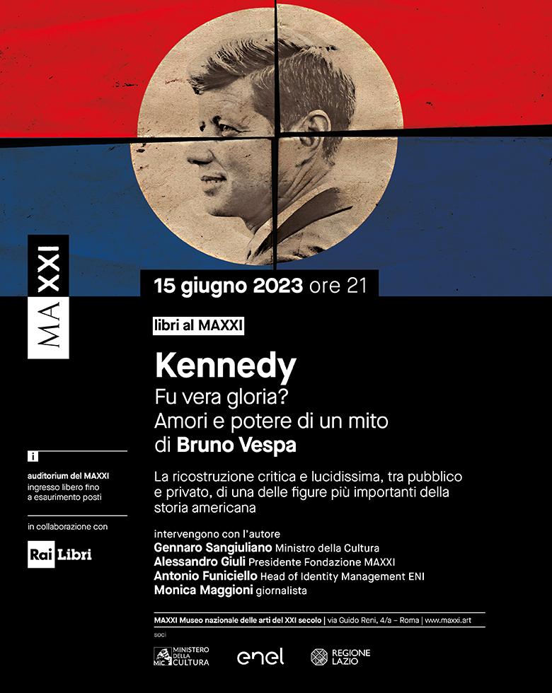 Kennedy oltre il mito. Bruno Vespa ricostruisce le origini familiari e l’ascesa al potere di “Jack”, gli anni di governo, le luci e le ombre di una presidenza, l’assassinio di Dallas. Giovedì 15 giugno alle 21 il volume sarà presentato al MAXXI, Museo nazionale delle arti del XXI secolo, in via Guido Reni, 4/a  a Roma. All’incontro, moderato dalla giornalista Monica Maggioni, prenderanno parte Gennaro Sangiuliano, ministro della Cultura, Alessandro Giuli, presidente della fondazione MAXXI, Antonio Funiciello, head of identity management ENI.