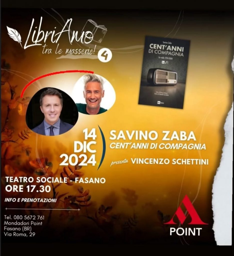 Doppio appuntamento in Puglia con Savino Zaba e il suo “Cent’anni di compagnia” (Rai Libri). Sabato 14 dicembre alle ore 17.30 l’autore incontrerà i lettori al Teatro Sociale di Fasano (moderatore Vincenzo Schettini), domenica 15 alle ore 17.30 sarà invece al Riva Club di Bari (moderatore Attilio Romita). Il volume è un viaggio intenso e appassionante nella storia della radio italiana: dalle prime trasmissioni dell’URI negli anni Venti alla propaganda fascista nel periodo bellico, dalla radio strumento di divulgazione della cultura di massa nel secondo Dopoguerra fino all’esplosione delle emittenti locali e all’ingresso nell’era digitale.