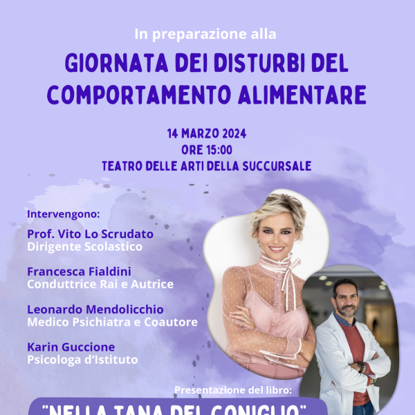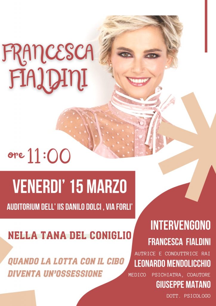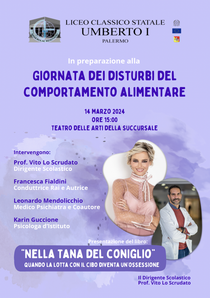 Il libro “Nella tana del coniglio. Quando la lotta con il cibo diventa un’ossessione”, edito Rai Libri e scritto dalla giornalista e conduttrice Rai Francesca Fialdini con il medico psichiatra Leonardo Mendolicchio, sarà presentato in occasione della Giornata mondiale dei disturbi del comportamento alimentare giovedì 14 marzo alle 15 al Teatro delle Arti della succursale del liceo classico Umberto I di Palermo (viale della Regione Siciliana Nord Ovest, 1759) e venerdì 15 marzo alle 11, nell’auditorium dell’Istituto Danilo Dolci di Partinico (via Goffredo Mameli, 4/ via Forlì). Sul palco con Francesca Fialdini nel liceo Umberto I, frequentato anche dal magistrato Giovanni Falcone, ci saranno il dirigente scolastico Vito Lo Scrudato, lo psichiatra Leonardo Mendolicchio e la psicologa dell’istituto Karin Guccione. Il 15 marzo saranno presenti con Francesca Fialdini, all’Istituto Danilo Dolci di Partinico, lo psichiatra Leonardo Mendolicchio e lo psicologo Giuseppe Matano.