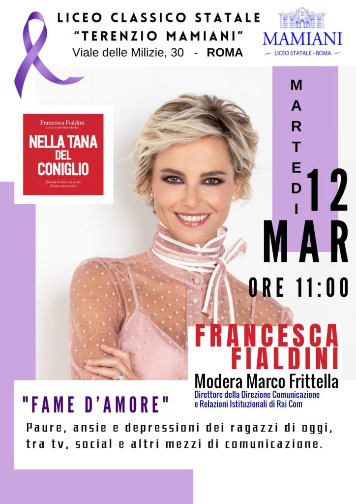 Ancora insieme agli studenti per parlare di storie del disturbo del comportamento alimentare. Proseguono gli incontri di Francesca Fialdini nelle scuole e nelle università italiane. L’autrice del volume “Nella tana del coniglio. Quando la lotta con il cibo diventa un’ossessione” (Rai Libri), il 12 marzo sarà a Roma nello storico liceo Terenzio Mamiani. A dialogare con l’autrice, in occasione della Giornata Mondiale dei Disturbi del Comportamento Alimentare (15 marzo), il giornalista Marco Frittella, direttore della Comunicazione di Rai Com. Scritto insieme allo psichiatra Leonardo Mendolicchio, il libro raccoglie le storie/testimonianze di Martha, Benedetta, Giulia, Valentina, Marco e Anna.
