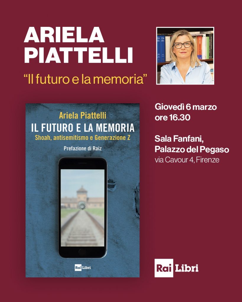 La forza dei figli della Generazione Z per custodire e proiettare nel futuro il ricordo della Shoah anche senza le voci dei sopravvissuti ai campi di sterminio. Giovedì 6 marzo alle ore 16.30 la Sala Fanfani di Palazzo del Pegaso a Firenze (via Cavour 4) ospiterà la presentazione del volume “Il futuro e la memoria. Shoah, antisemitismo e Generazione Z” (Rai Libri) di Ariela Piattelli. All’incontro con l’autrice prenderanno parte Monica Leonetti Cuzzocrea, insegnante e giornalista, Celeste Vichi, presidente dell’Unione Associazioni Italia Israele e lo studente Gabriel Venezia, nipote di Shlomo Venezia, uno dei pochissimi sopravvissuti al Sonderkommando.