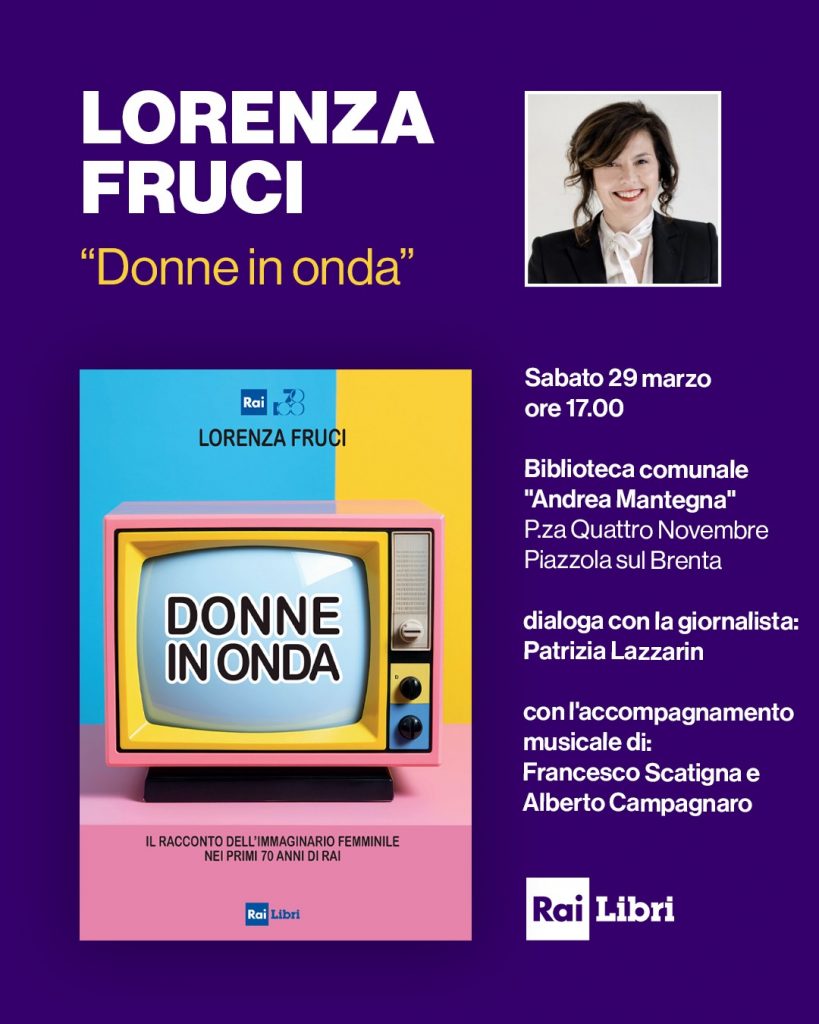 Un viaggio nella storia italiana attraverso la rappresentazione delle donne in Tv a settant’anni dalla prima trasmissione televisiva ufficiale della Rai. Sabato 29 marzo alle ore 17.00 “Donne in onda” (Rai Libri) di Lorenza Fruci sarà protagonista alla manifestazione “Donne e musica 2025” alla biblioteca comunale Andrea Mantegna a Piazzola sul Brenta (Padova). A dialogare con l’autrice sarà la giornalista Patrizia Lazzarin.