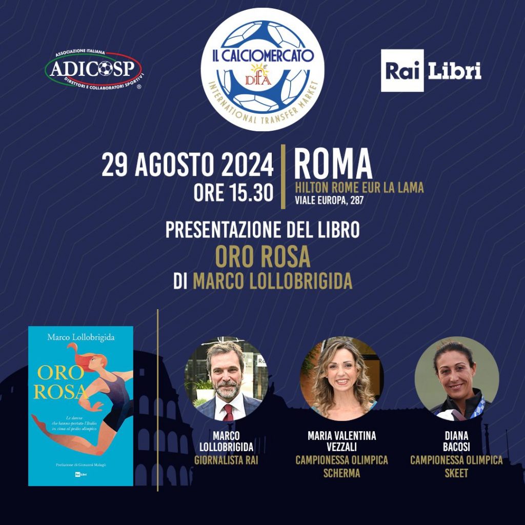 La giornata di chiusura del calciomercato estivo 2024-2025 ospiterà la presentazione di “Oro Rosa. Le donne che hanno portato l’Italia in cima al podio olimpico”, scritto da Marco Lollobrigida per Rai Libri. Ventidue storie di sport e di vita, un viaggio lungo quasi cento anni che attraversa i successi e le emozioni di atlete che hanno reso grande lo sport azzurro e l’Italia, da Ondina Valla a Federica Pellegrini, da Sara Simeoni a Elisa Di Francisca. A dialogare con l’autore, giovedì 29 agosto alle ore 15.30, le campionesse olimpiche Valentina Vezzali e Diana Bacosi. L’incontro si terrà presso l’Hilton Rome Eur La Lama, Viale Europa 287, 00144 Roma.